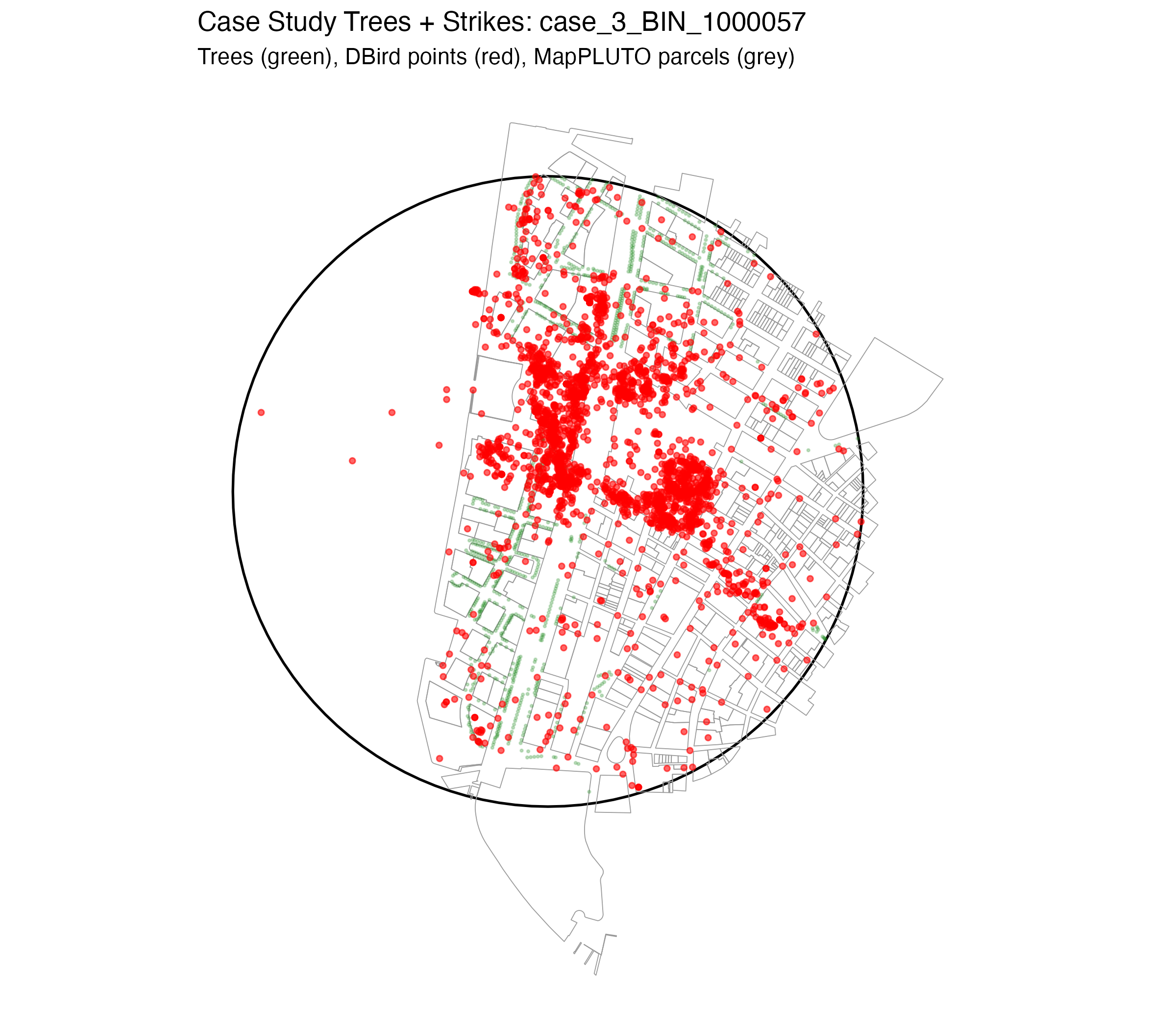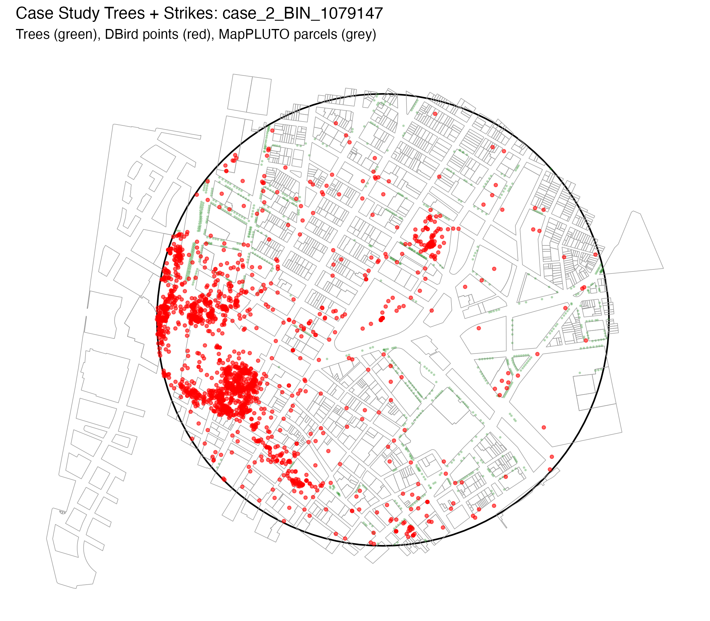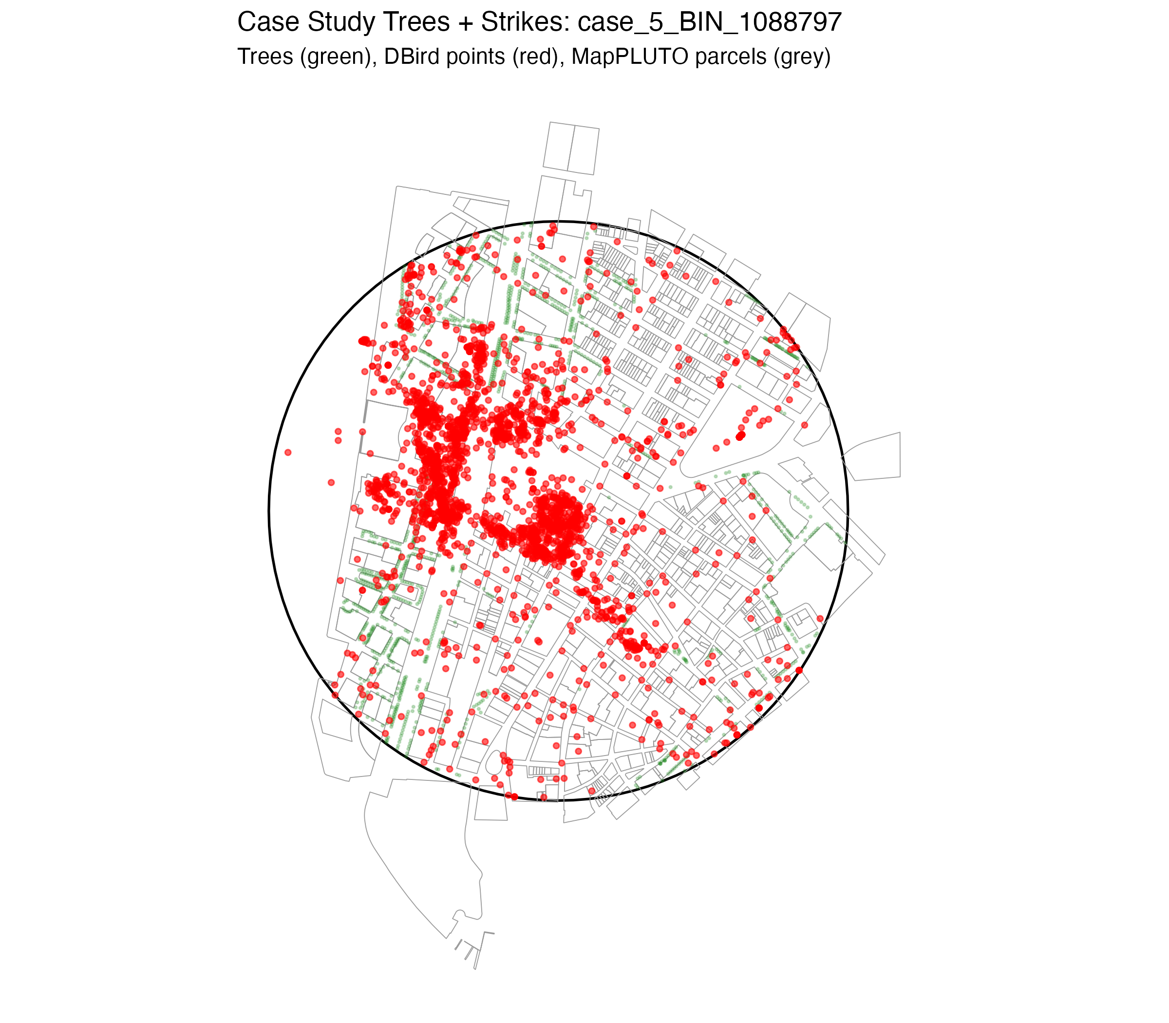 These case study maps display DBird collision points (red) overlaid on MapPLUTO parcel outlines (grey) within a buffered hotspot area. Street trees from the NYC Tree Census are shown in green, providing local environmental context around the collision locations. The circular buffer defines the spatial extent used for case-level analysis and comparison across sites. This closer look provides hints at ecological context.