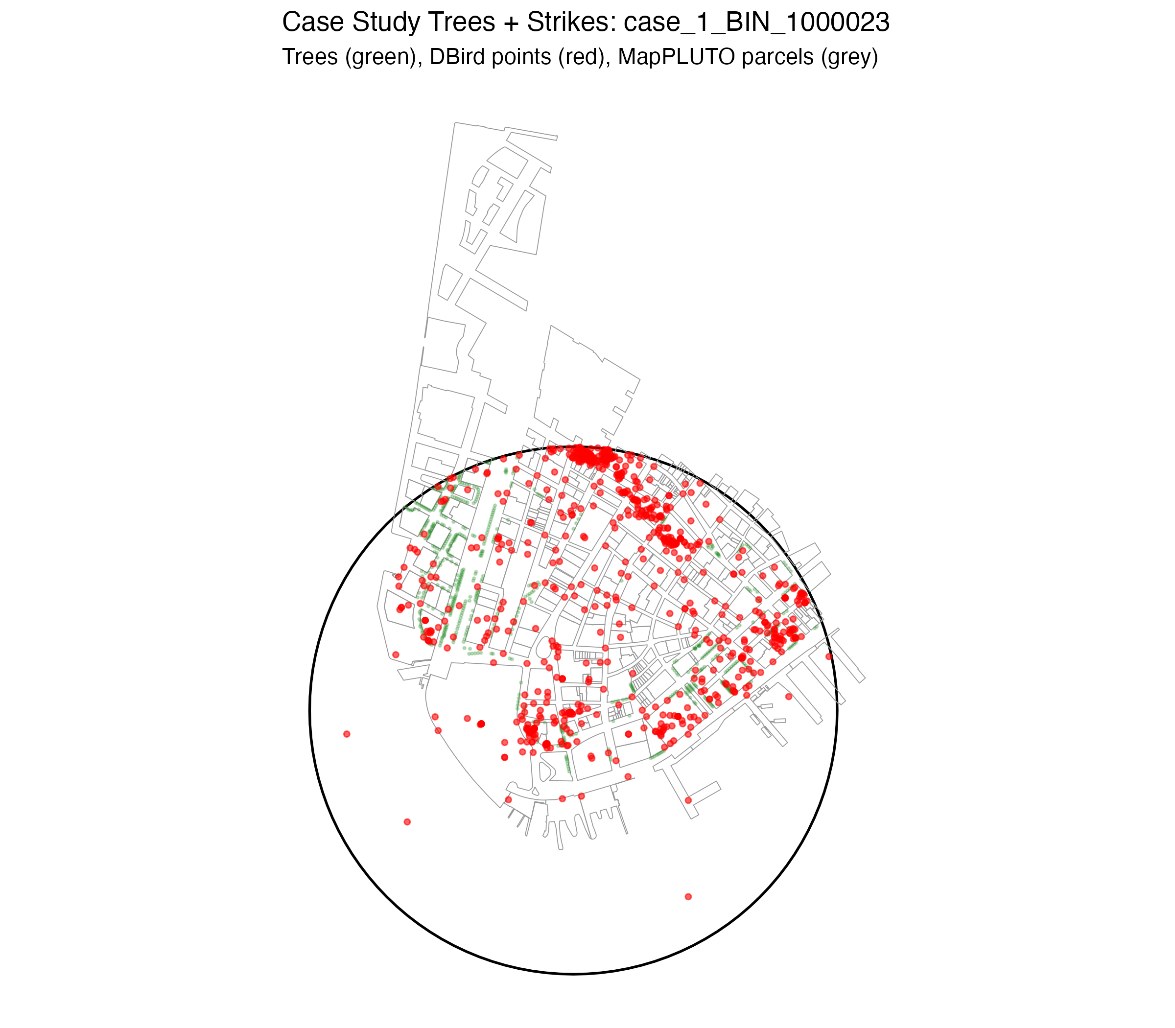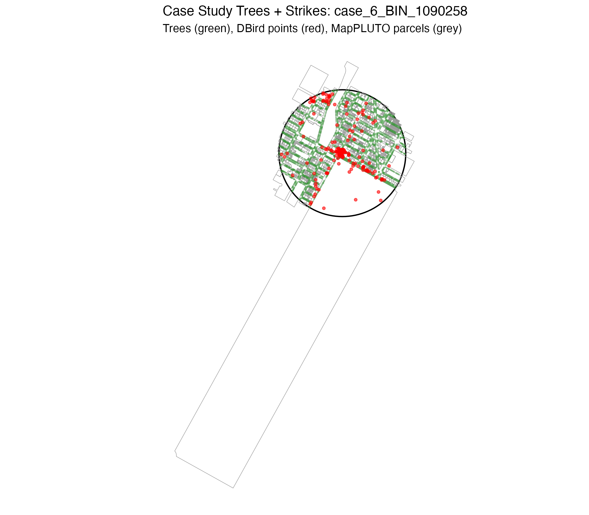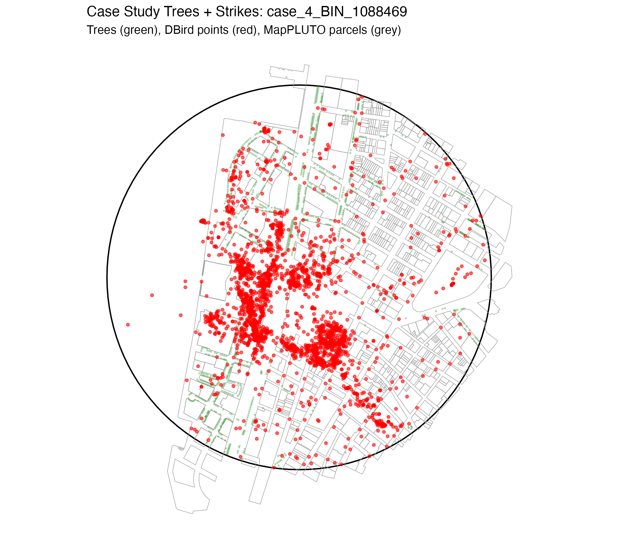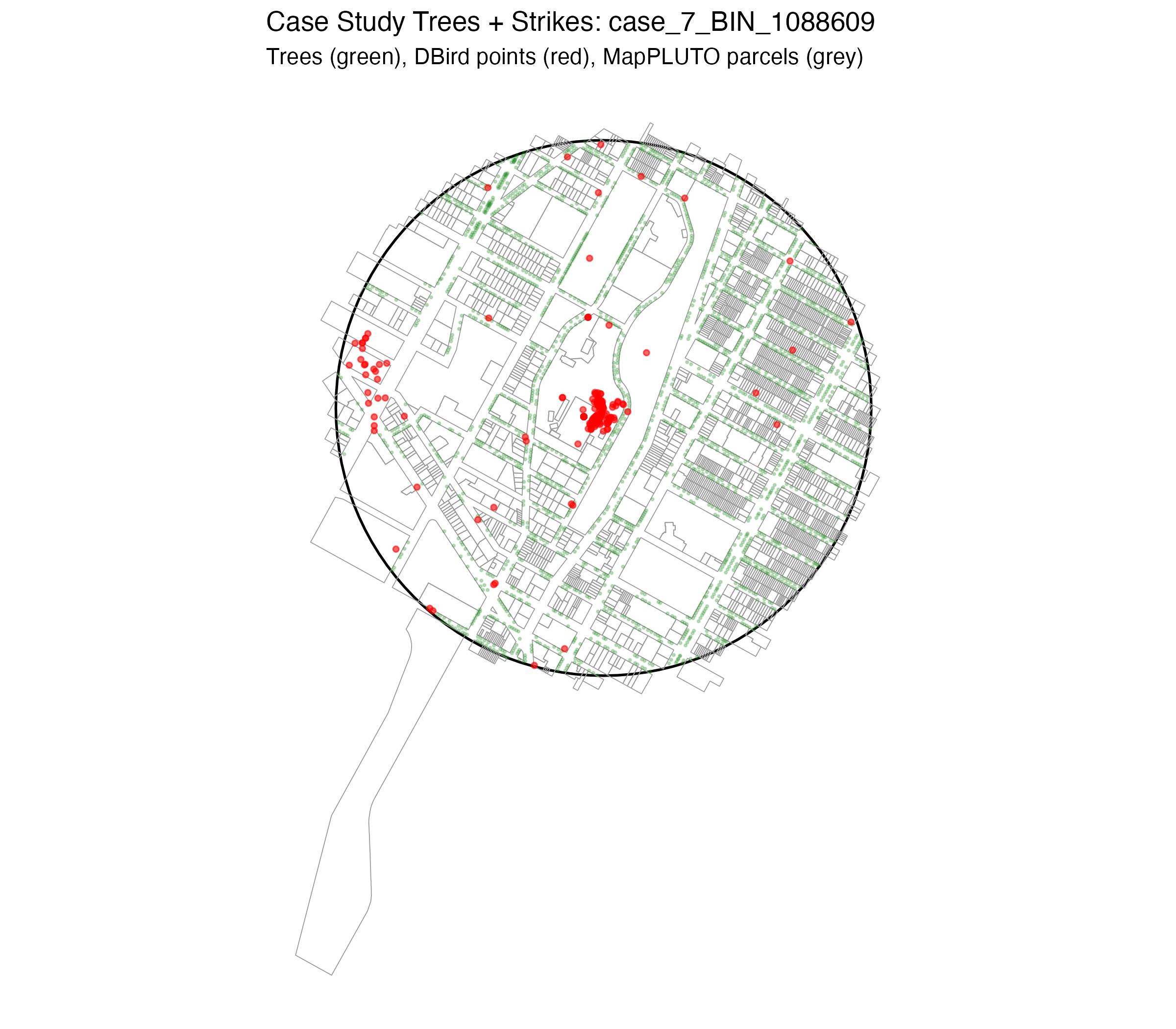 These case study maps display DBird collision points (red) overlaid on MapPLUTO parcel outlines (grey) within a buffered hotspot area. Street trees from the NYC Tree Census are shown in green, providing local environmental context around the collision locations. The circular buffer defines the spatial extent used for case-level analysis and comparison across sites. This closer look provides hints at ecological context.