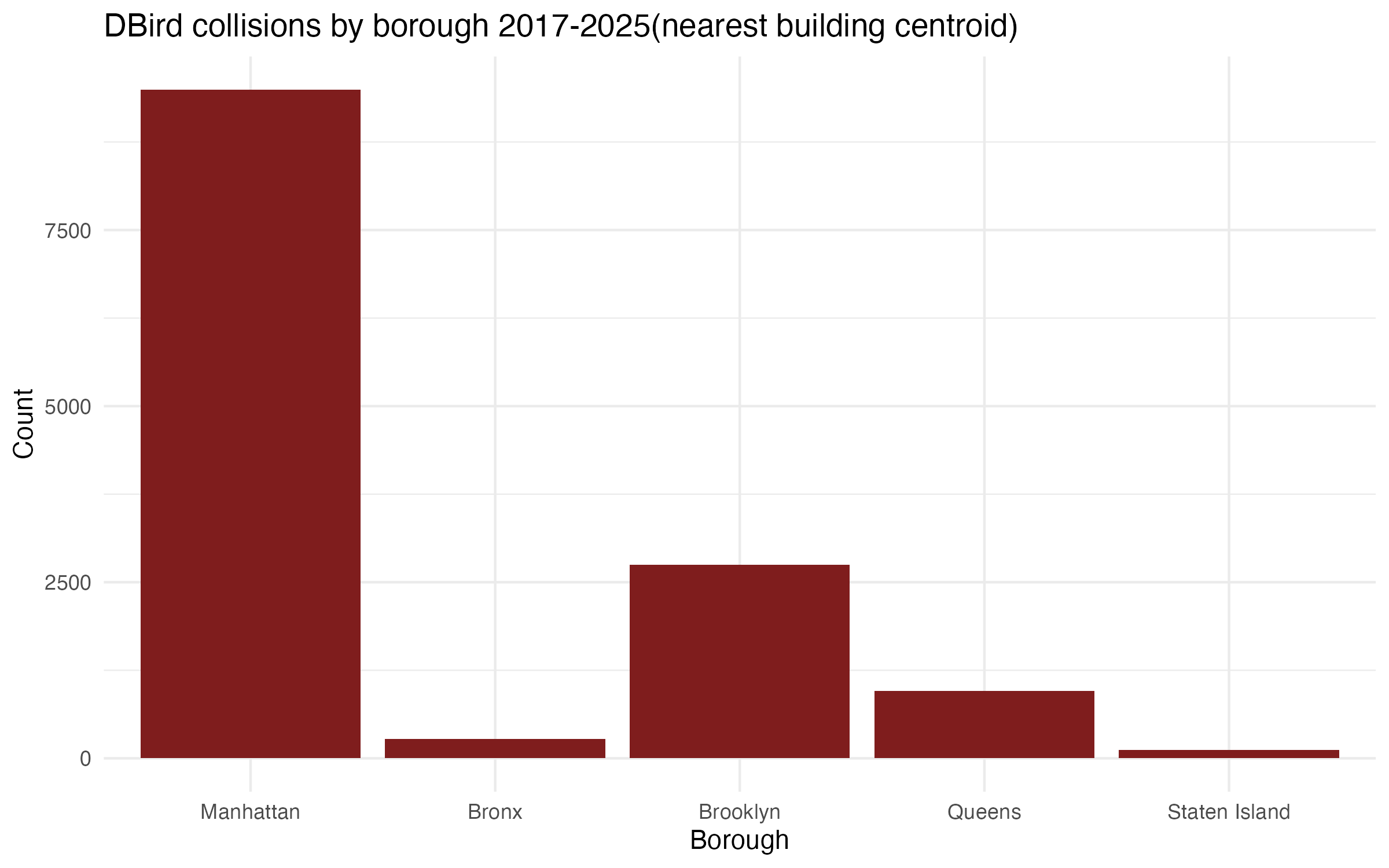 Figure 3: DBird collision reports summarized by borough using nearest building centroid.