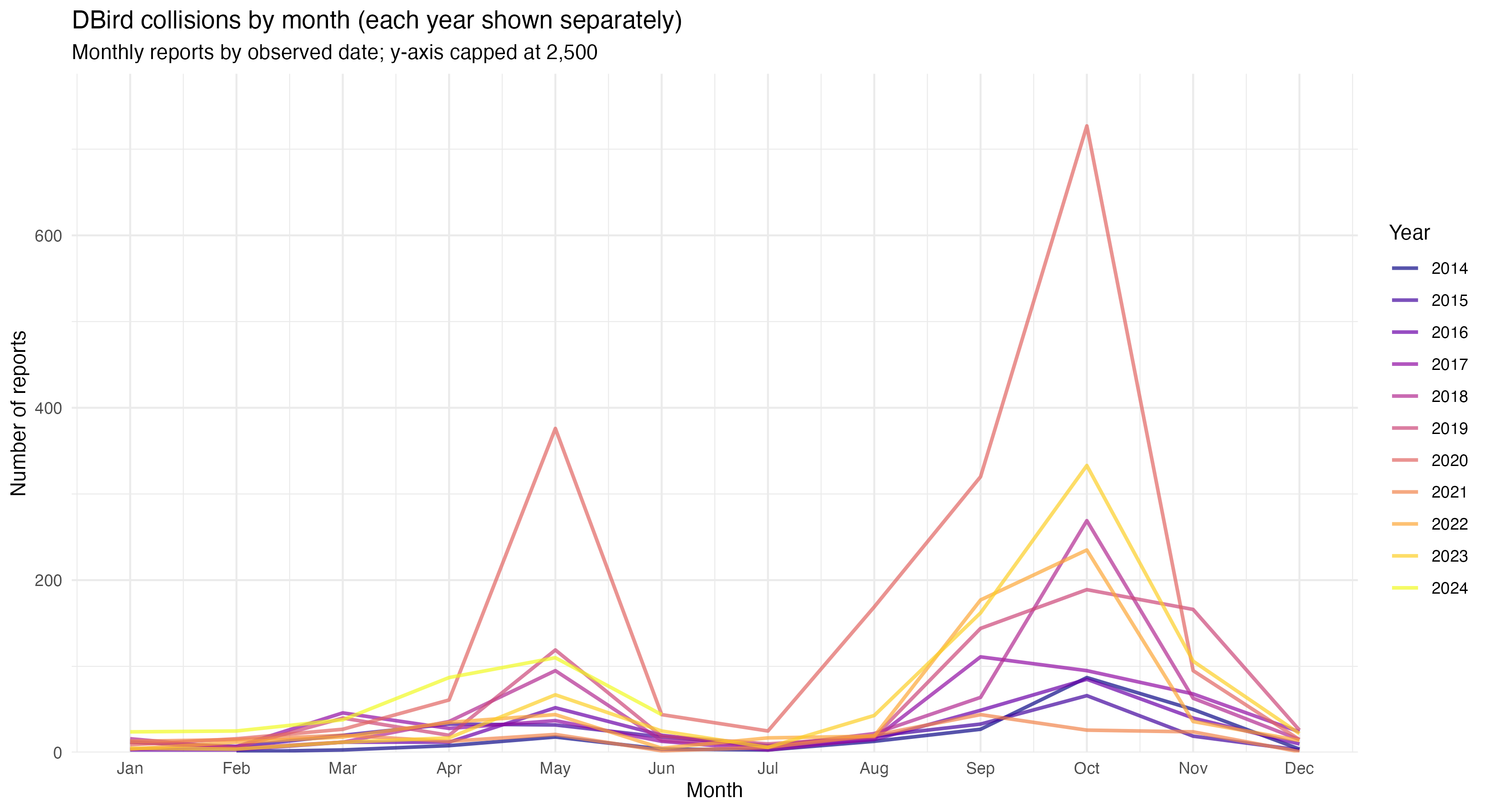 • DBird collision reports (CSV) — gathered from the org directly, partial resolution: point locations (approximate); Temporal resolution: observed date (2014–2025).