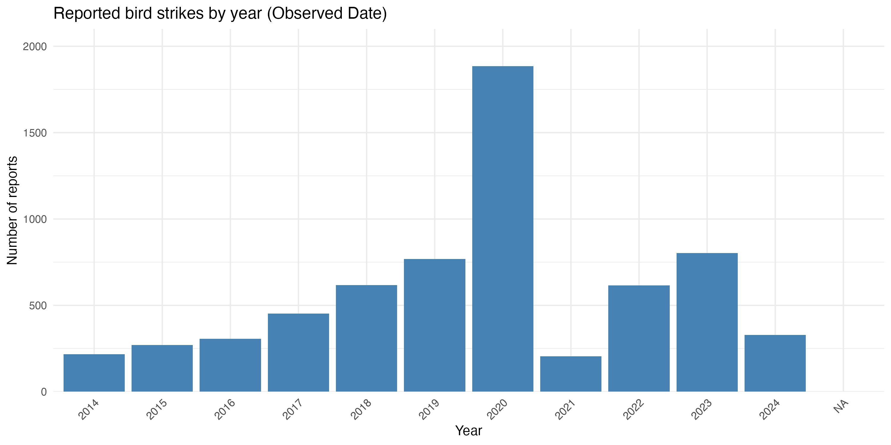 The above graph shows annual counts of reported bird strikes in NYC. Rather than representing a clear statistical distribution, this plot reflects varied temporal variation. Notably, in 2020 we saw an increase in reported strikes. This may be because there was less interruption to migration by way of human interference and pollution. Accompanied by an increase in outdoor activities like birding during the pandemic this may help explain the stark increase.