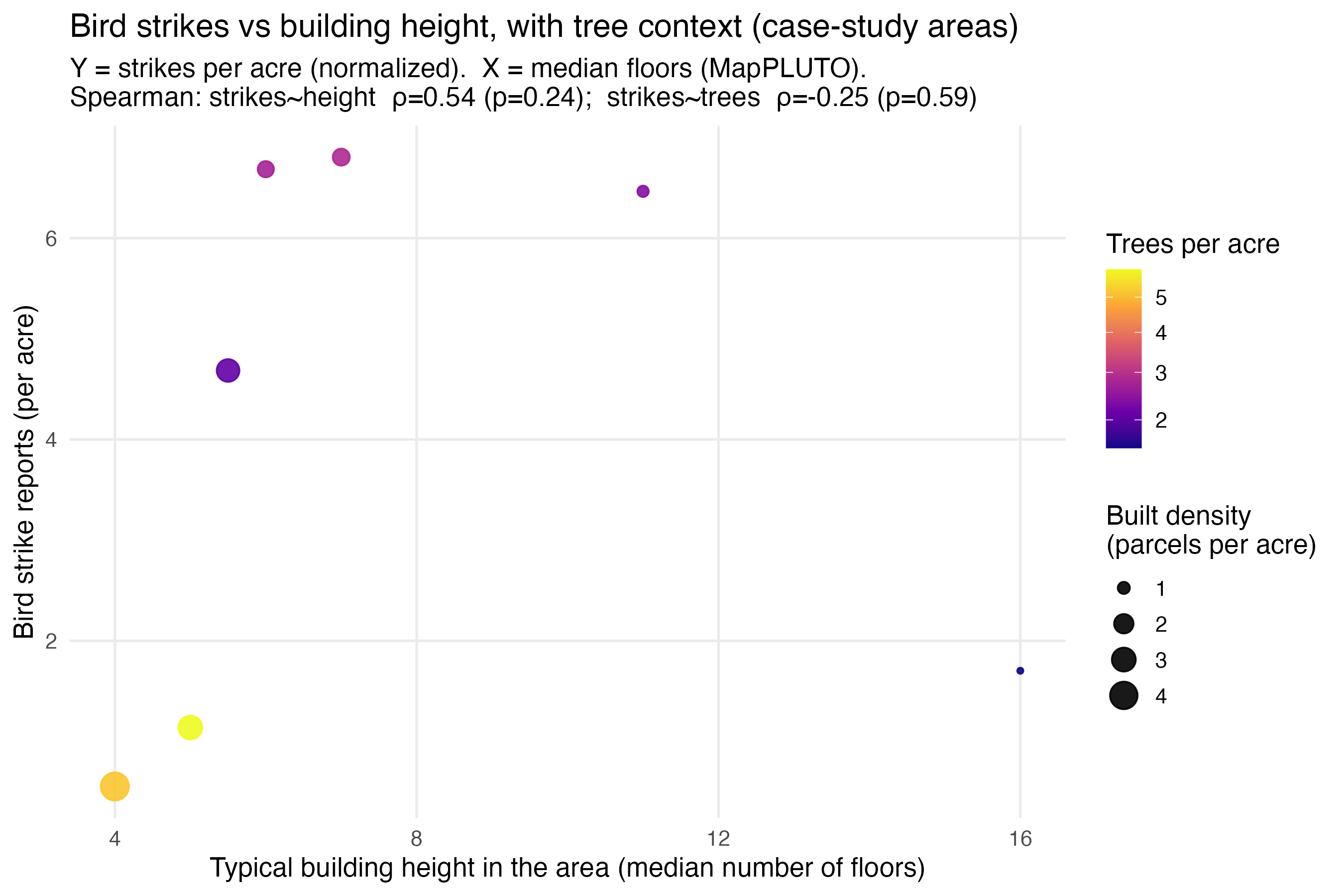 This figure presents a case level comparison of bird strike intensity normalized by area against typical building height, with tree density shown as a continuous color scale and built density represented by point size. Each point corresponds to a buffered case-study area, integrating multiple characteristics of the surrounding built and ecological environment into a single view. Critically, the pearson correlation reveals that both tree density, and building height together cannot predict whether or not strikes will happen. While the sample size is small, it could be used as an inference for later assumptions.