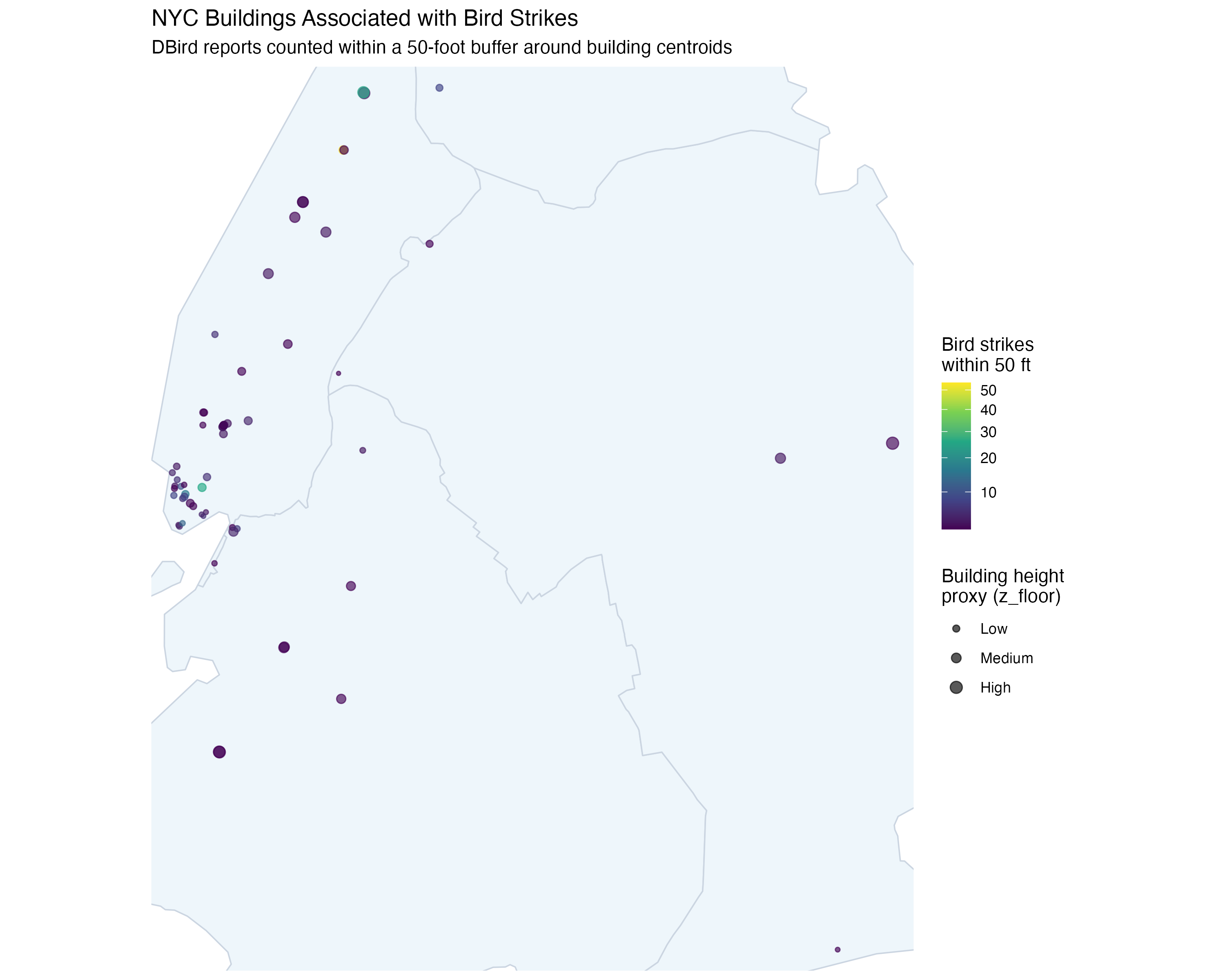 This map displays buildings in New York City that are associated with more than 3 reported bird strikes, measured within a 50-foot buffer around each building centroid. Color intensity reflects the number of recorded strike reports, while symbol size represents a proxy for building height (z_floor). Clusters of higher strike counts appear in specific areas of the city, suggesting localized concentrations of bird–building interactions that warrant closer examination. Notably, the lower east side has a high amount of strikes, yet lower laying buildings as compared to the more vertical midtown section.