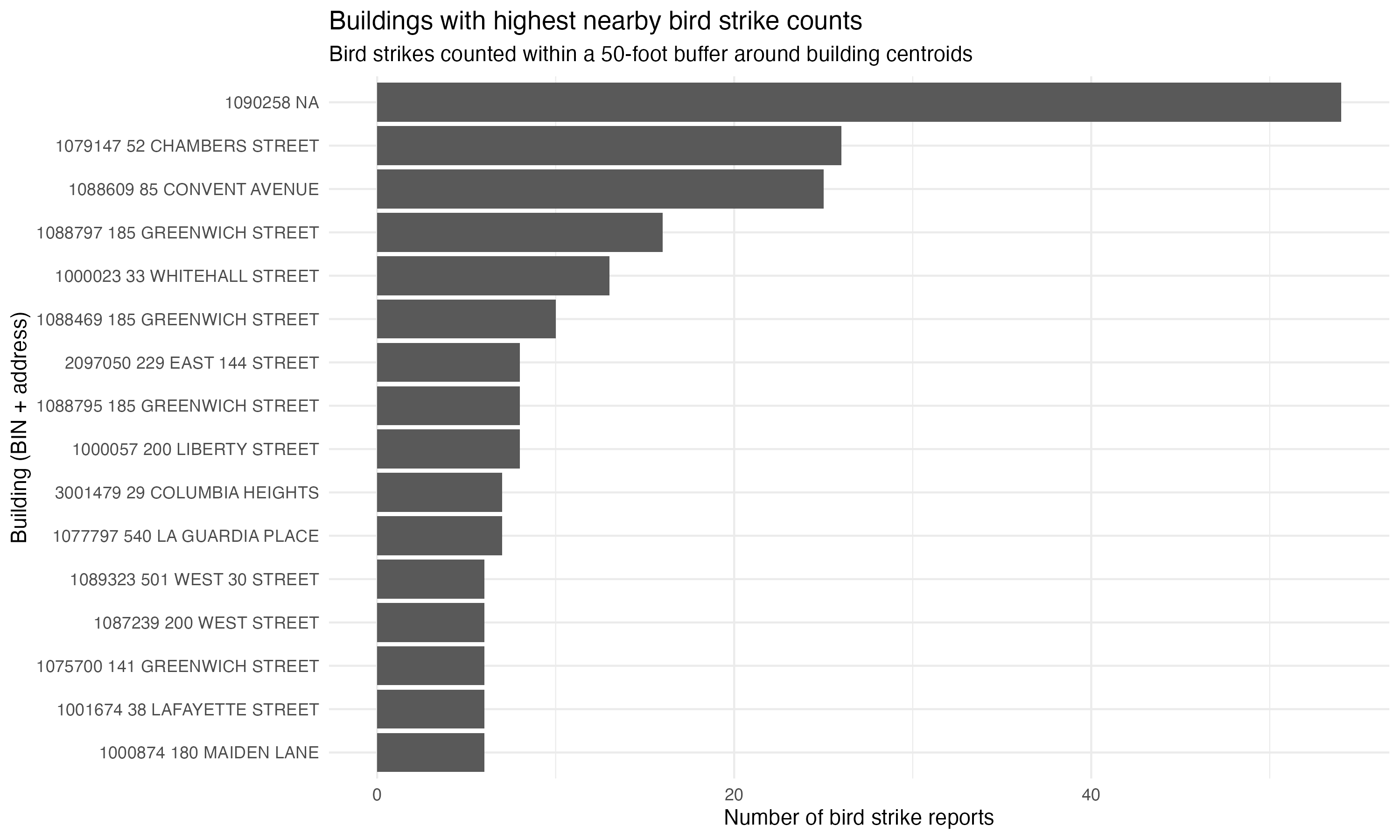 The above graph displays the bird strike counts (within a buffer of 50 ft). Interestingly, while notable tall buildings like the one world trade center make the top 5 leaders in this class are not explicitly tall or towering buildings.